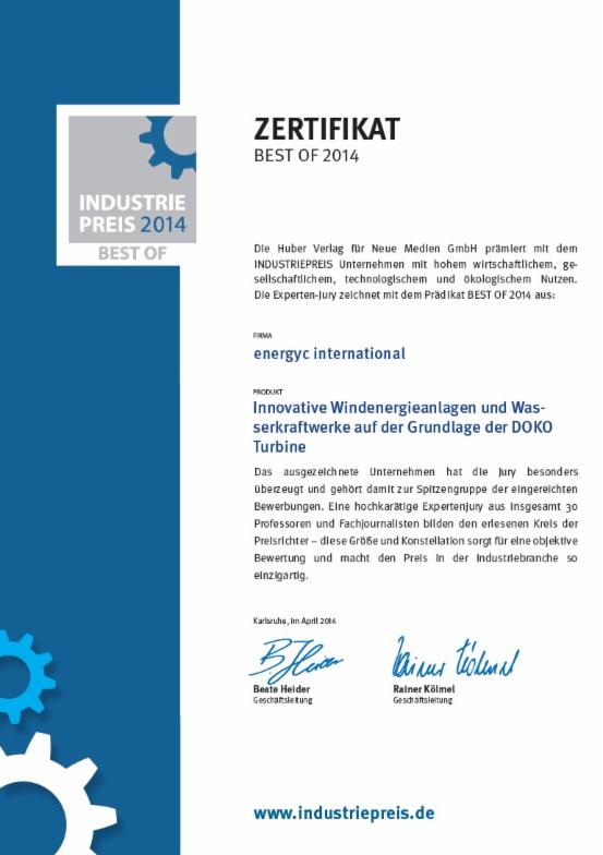 Mit dem INDUSTRIEPREIS werden durch die Huber Verlag für Neue Medien GmbH Unternehmen mit hohem wirtschaftlichem, gesellschaftlichem, technologischem und ökologischem Nutzen ausgezeichnet. Die Experten-Jury zeichnet mit dem Prädikat BEST OF 2014 die Firma energyc® international aus, mit dem Produkt Innovative Windenergieanlagen und Wasserkraftwerke auf der Grundlage der DOKO Turbine.